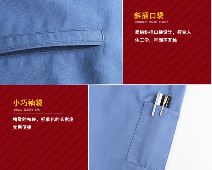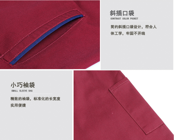 也有的企業(yè)會(huì)在左衣袖上加一個(gè)臂袋,衣袖上的臂袋是考慮在工作時(shí)做一些記錄時(shí)要用的筆拿取方便,另外還可以根據(jù)工作需要多做或少做一些口袋,這主要根據(jù)各企業(yè)的工作環(huán)境和要求制作。