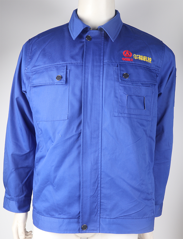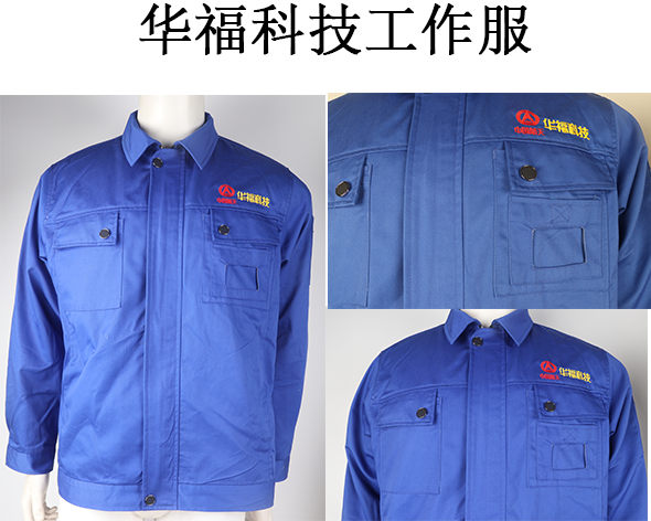 華??萍脊ぷ魅藛T主要也是車間流水工作大部分是男性員工,在設計顏色采用了深藍色,還是傳統的工裝款式,布料采用滌棉紗卡,這種面料勻整光潔,質樸柔和,吸濕耐磨,尤其經過熨燙后,柔軟舒適,沒有折痕,是作為工裝的首選面料。