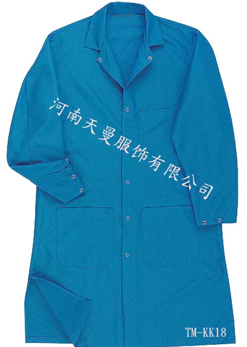 防靜電涂層布料:98% 棉,2% 尼龍;前門襟6個四合扣,袖口各兩個四合扣;一個前胸貼兜, 兩個前下貼兜。
