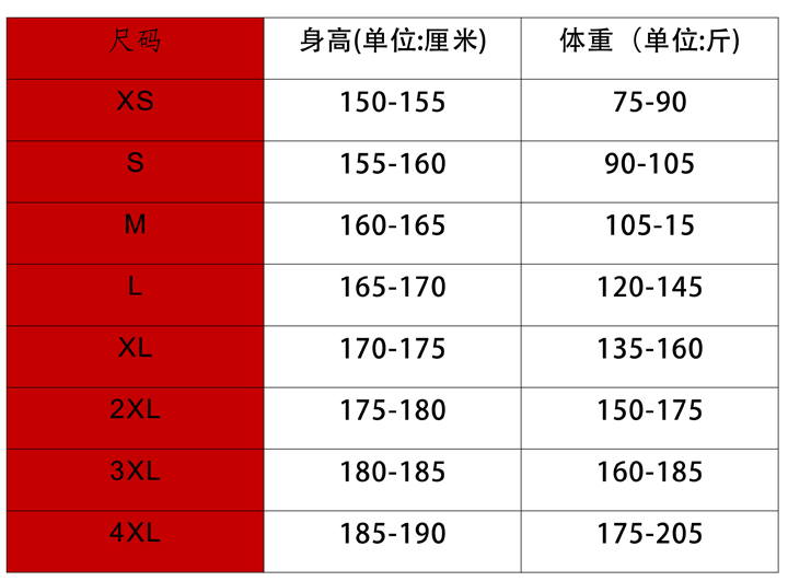溫馨提示:請(qǐng)對(duì)照每個(gè)員工的身高和體重選擇尺碼,根據(jù)您訂購(gòu)的產(chǎn)品,選擇相應(yīng)的尺碼圖表,先用身高畫出橫線,再用體重畫出豎線,交叉點(diǎn)所在色塊表示合適的尺碼(身高單位:cm,體重單位:kg)
